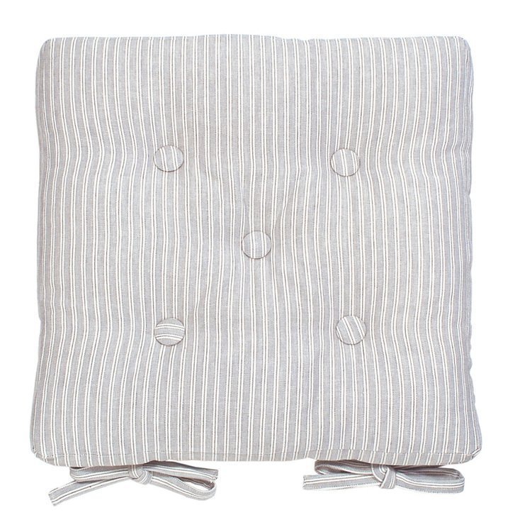 Classic ticking stripe seat pad with ties in bang on trend grey. 40 x 40cm. 100 cotton outer. Washable
